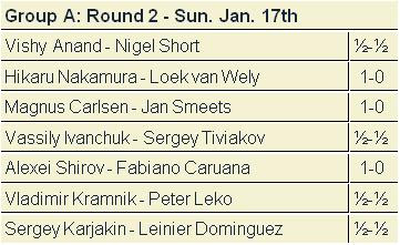 En el Grupo A, Shirov derrotó de blancas al joven italiano Fabio Caruana en 64 movimientos, dentro de una partida que se jugó después de que que quedara planteada la Ruy López en la apertura y terminara con un final de una torre por bando y alfiles de distinto color.